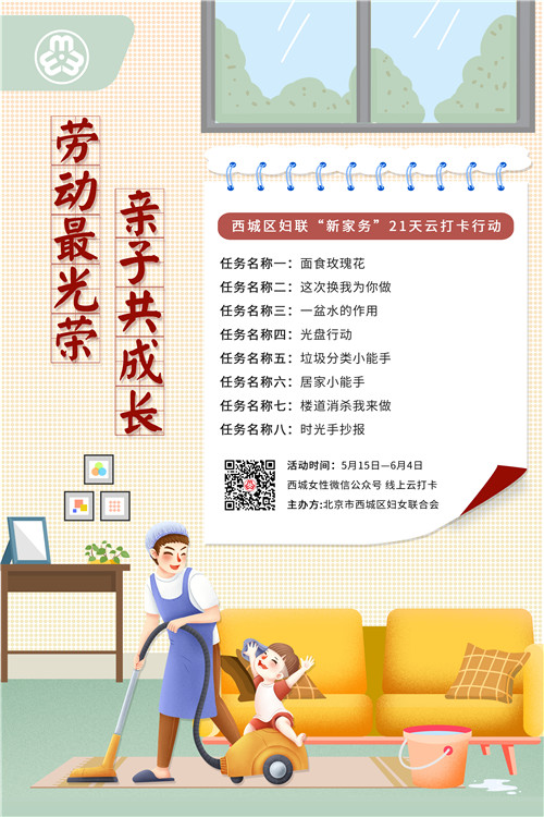 此次云打卡行动,是西城区妇联对于“新家务”理念的进一步探索与实践。活动借助新媒体平台通过线上打卡,联动线下亲子互动,将“新家务”行动与“劳动教育”相结合号召广大家庭形成重视劳动的新时代家庭教育观,争做相亲相爱、向上向善的“最美家庭”。